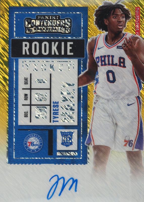 Auctions Ending Soon for Tyrese Maxey 2020 Contenders #123 Rookie Ticket Auto - Premium Gold Shimmer /1 (No Ball) RAW