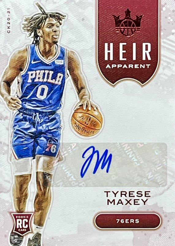 The Tyrese Maxey 2020 Court Kings #HA-TYM Heir Apparent Autographs - Ruby (/75) Rookie card in Raw condition has not changed in price in the last 30 days and was last sold for $77.00 .