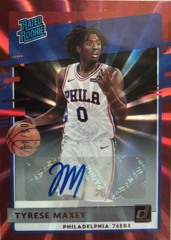 The Tyrese Maxey 2020 Donruss #211 Rated Rookie Signatures - Holo Red Laser /49 card in Raw condition has not changed in price in the last 30 days and was last sold for $170.00 .
