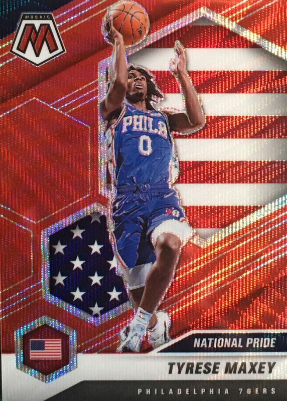 The Tyrese Maxey 2020 Mosaic #259 National Pride - Red Wave Rookie card in Raw condition has moved down -$3.75 (-75.0%) in the last 30 days and was last sold for $1.25 .