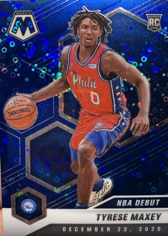 The Tyrese Maxey 2020 Mosaic #263 NBA Debut - Fast Break Blue /85 Rookie card in Raw condition has not changed in price in the last 30 days and was last sold for $49.99 .