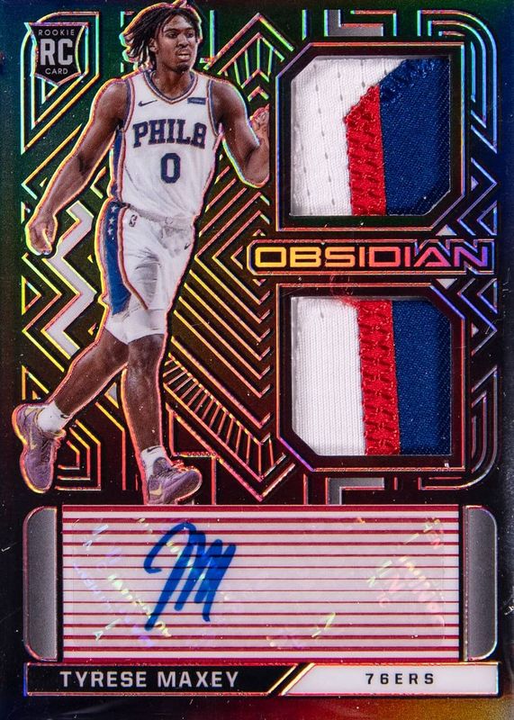 This card is 1 of 17 Tyrese Maxey's card variations in the 2020 Obsidian set being tracked by Sports Card Investor, including Rookie Jersey Autographs - Electric Etch Green (/25), Rookie Jersey Autographs - Electric Etch Green Flood, Rookie Jersey Autographs - Electric Etch Purple (/49), Rookie Jersey Autographs - Electric Etch Red Flood, and Rookie Jersey Autographs - Electric Etch Yellow Flood.