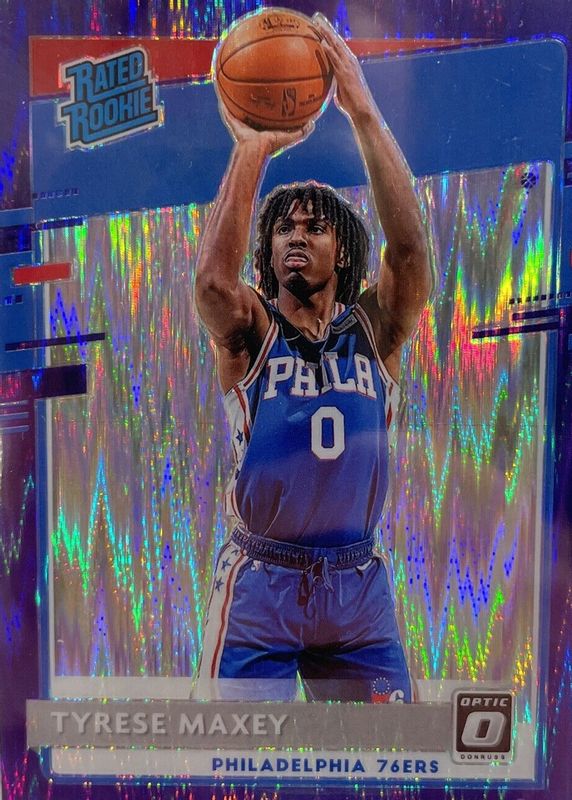 The Tyrese Maxey 2020 Optic #171 Purple Shock Rookie card in Raw condition has moved up $8.00 (+114%) in the last 30 days and was last sold for $15.00 .