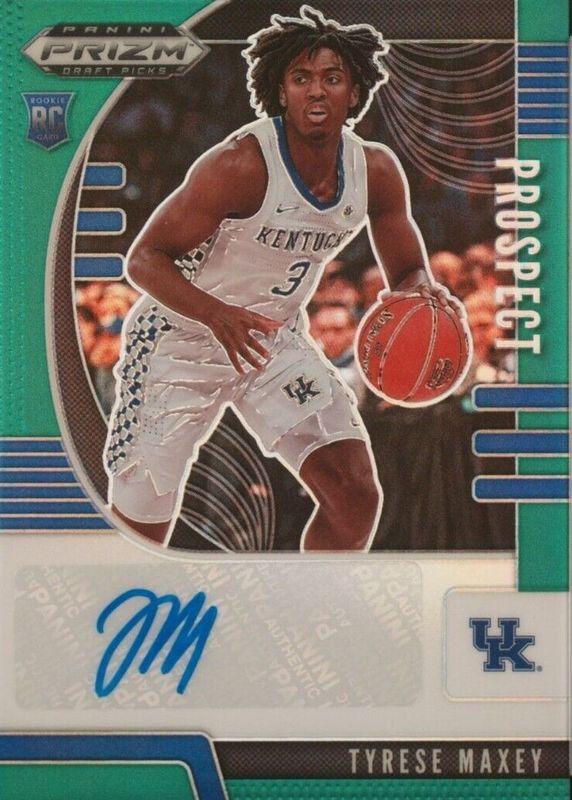 The Tyrese Maxey 2020 Prizm Draft Picks #PA-TM Prospect Autographs - Green Rookie card in Raw condition has not changed in price in the last 30 days and was last sold for $50.00 .