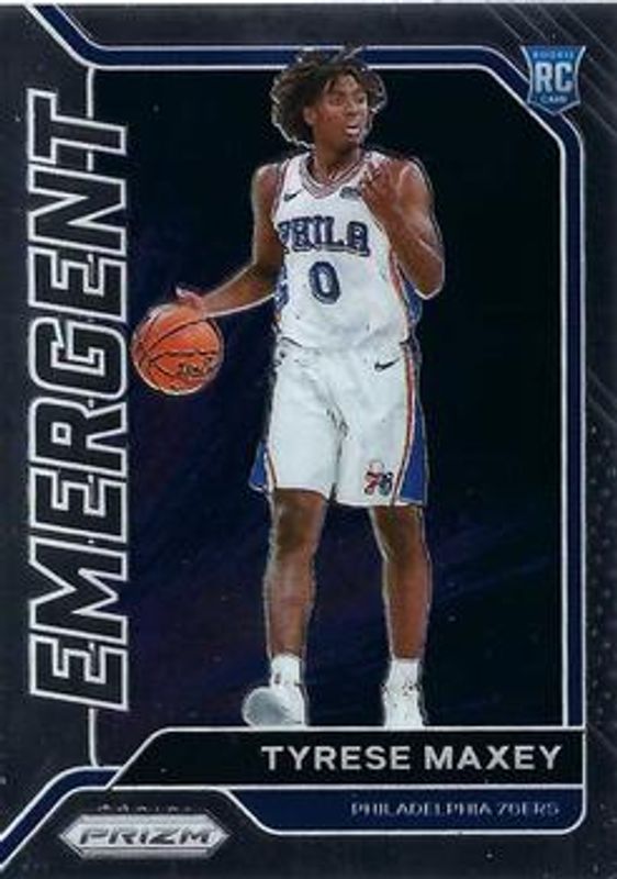 The Tyrese Maxey 2020 Prizm #24 Emergent Rookie card is 1 of 76 Tyrese Maxey's card variations in the 2020 Prizm set being tracked by Sports Card Investor, including Base, Choice Blue Yellow Green, Fast Break, Green, and Green Ice.