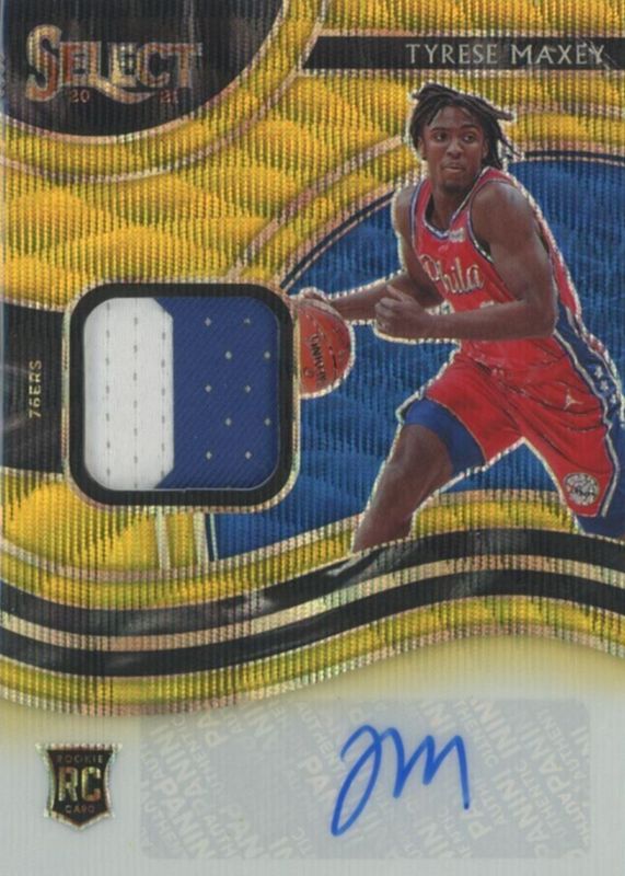 The Tyrese Maxey 2020 Select #RJA-MAX Rookie Jersey Autographs - Gold Wave card in Raw condition has not changed in price in the last 30 days and was last sold for $610.00 .