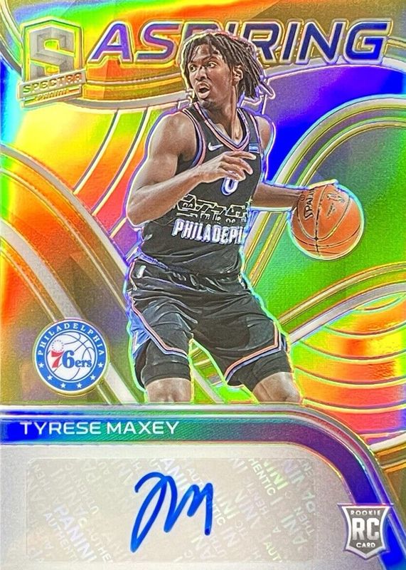 This card is 1 of 24 Tyrese Maxey's card variations in the 2020 Spectra set being tracked by Sports Card Investor, including Aspiring Autographs (/49), Aspiring Autographs - Astral (/35), Aspiring Autographs - Meta (/25), Rookie Jersey Autographs (/149), and Rookie Jersey Autographs - Asia.