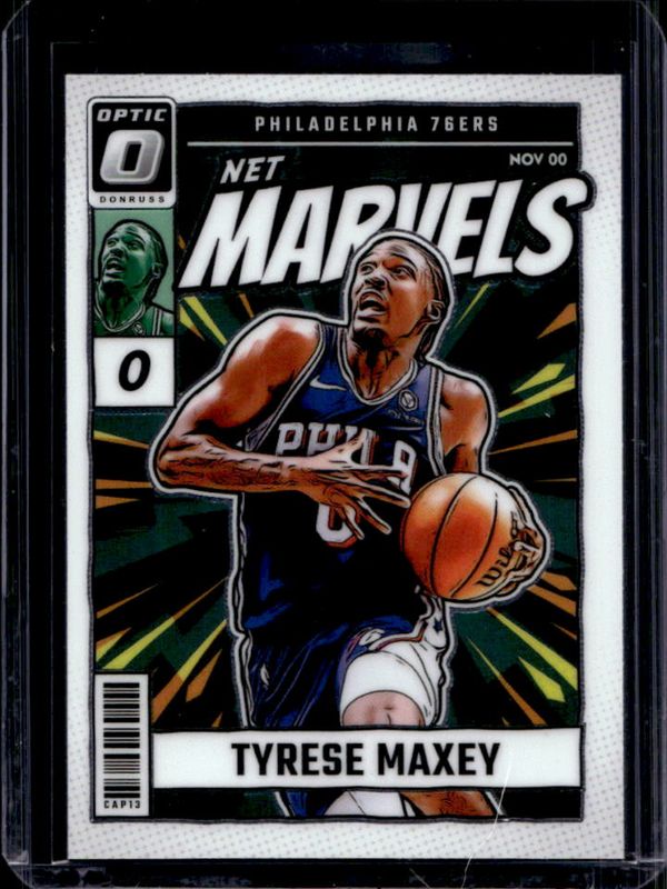 The Tyrese Maxey 2024 Optic #19 Net Marvels card is 1 of 100 Tyrese Maxey's card variations in the 2024 Optic set being tracked by Sports Card Investor, including Base, Blue Velocity, Checkerboard, Choice, and Fast Break.