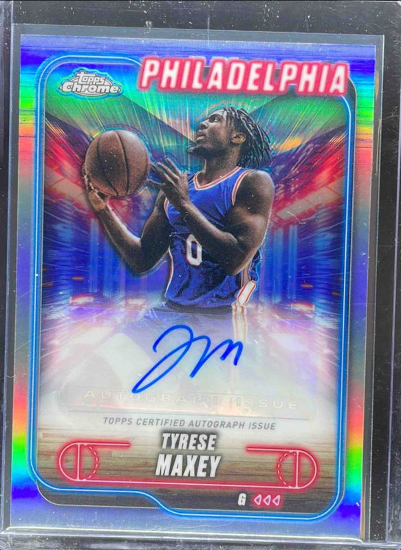 The Tyrese Maxey 2024 Topps Chrome #TCA-TM Chrome Autographs - Refractor card is 1 of 80 Tyrese Maxey's card variations in the 2024 Topps Chrome set being tracked by Sports Card Investor, including Base, Blue Basketball Refractor, Magenta Refractor, Negative Refractor, and Pink Basketball Refractor.