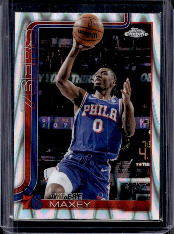 The Tyrese Maxey 2025 Topps Chrome #185 RayWave Refractor card is 1 of 141 Tyrese Maxey's card variations in the 2025 Topps Chrome set being tracked by Sports Card Investor, including Base, Basketball Refractor, Box Set Refractor, Image Variation, and Lightboard Logo Refractor.
