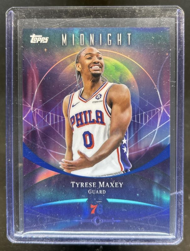 The Tyrese Maxey 2025 Topps Midnight #8 Base card is 1 of 14 Tyrese Maxey's card variations in the 2025 Topps Midnight set being tracked by Sports Card Investor, including Moon Beam, Zodiac, Morning /149, Twilight /99, and Dusk /75.