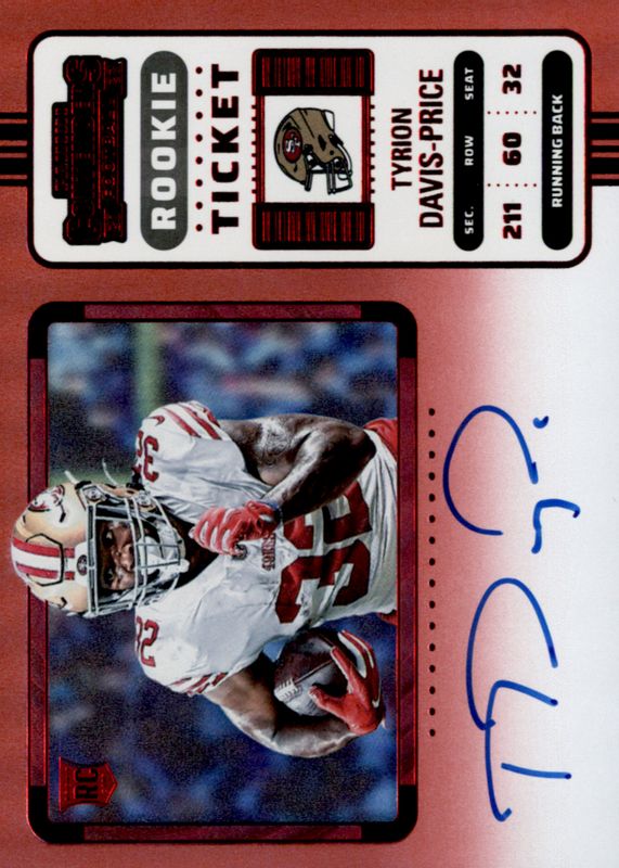 This card is 1 of 28 Tyrion Davis-Price's card variations in the 2022 Contenders set being tracked by Sports Card Investor, including Rookie Ticket Auto, Rookie Ticket Auto - Red Zone Ticket, Rookie Ticket Auto - Silver (/99), Rookie Ticket Auto - Ticket Stub (/32), and Rookie Ticket Auto - Wild Card.