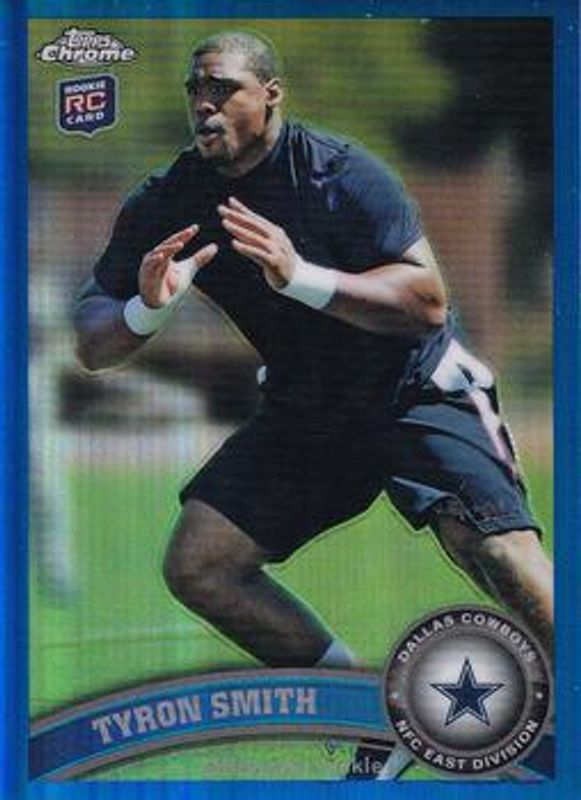 The Tyron Smith 2011 Topps Chrome #38 Blue Refractor /199 Rookie card is 1 of 16 Tyron Smith's card variations in the 2011 Topps Chrome set being tracked by Sports Card Investor, including Base, Orange Refractor, Refractor, X-Fractor, and Purple Refractor /499.