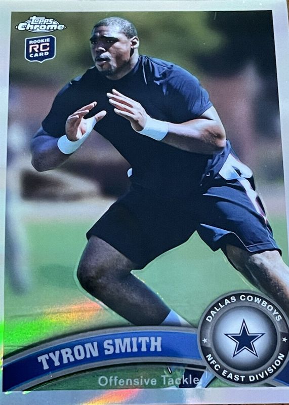 The Tyron Smith 2011 Topps Chrome #38 Refractor Rookie card in Raw condition has not changed in price in the last 30 days and was last sold for $9.98 .