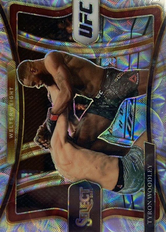This card is 1 of 48 Tyron Woodley's card variations in the 2021 Select UFC set being tracked by Sports Card Investor, including Concourse Disco, Concourse Scope, Concourse Silver, Concourse Tri-Color, and Octagonside Disco.