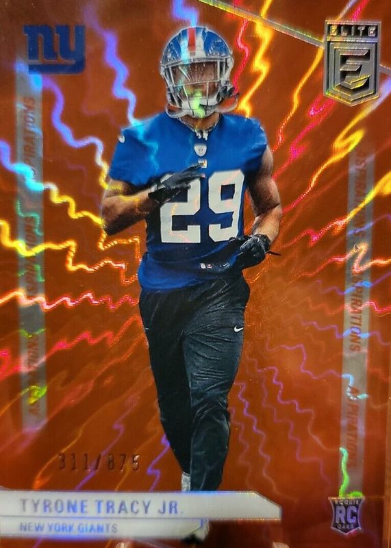 This card is 1 of 28 Tyrone Tracy Jr.'s card variations in the 2024 Elite set being tracked by Sports Card Investor, including Base Rookie /999, Aspirations (/71), Green Disco, Pink, and Status (/29).