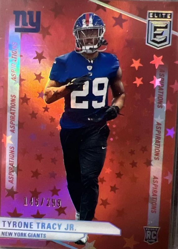The Tyrone Tracy Jr. 2024 Elite #144 Aspirations Stars /299 Rookie card in Raw condition has not changed in price in the last 30 days and was last sold for $5.00 .