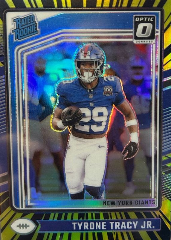 This card is 1 of 58 Tyrone Tracy Jr.'s card variations in the 2024 Optic set being tracked by Sports Card Investor, including Base, Blue Hyper, Blue Scope, Green Hyper, and Green Velocity.