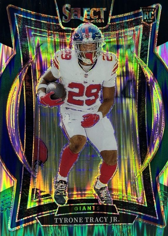 This card is 1 of 72 Tyrone Tracy Jr.'s card variations in the 2024 Select set being tracked by Sports Card Investor, including Concourse, Field Level, Concourse Black & Blue Shock, Concourse Black & Gold Shock, and Concourse Black & Orange Shock.