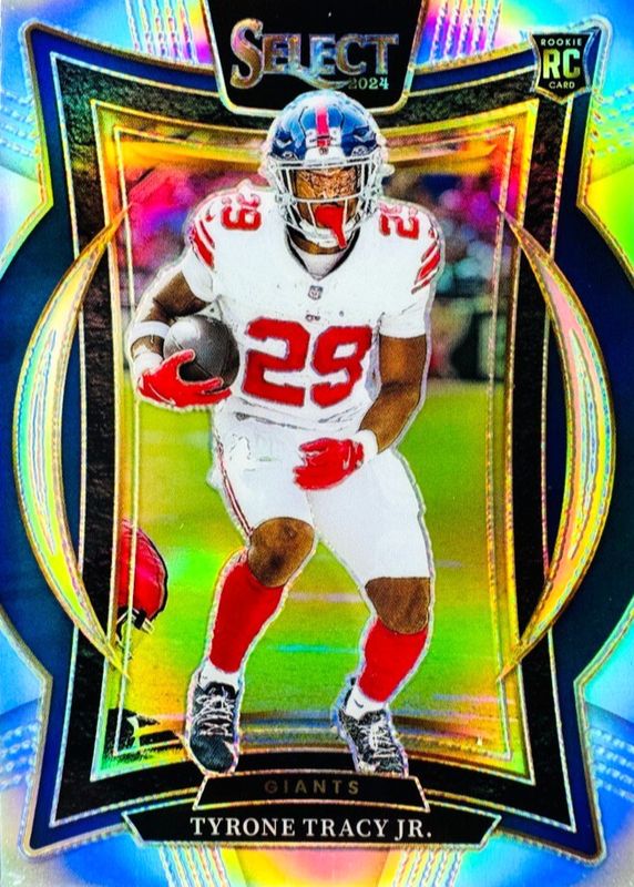 This card is 1 of 72 Tyrone Tracy Jr.'s card variations in the 2024 Select set being tracked by Sports Card Investor, including Concourse, Field Level, Concourse Black & Blue Shock, Concourse Black & Gold Shock, and Concourse Black & Green Shock.