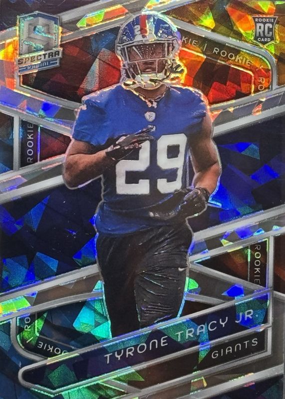 This card is 1 of 19 Tyrone Tracy Jr.'s card variations in the 2024 Spectra set being tracked by Sports Card Investor, including Base, Silver, Celestial /99, Hyper /75, and Interstellar /60.
