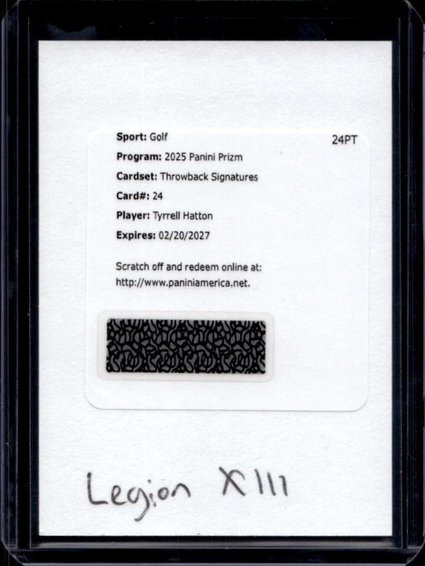 The Tyrrell Hatton 2025 Prizm LIV #TS-TH Throwback Signatures card is 1 of 87 Tyrrell Hatton's card variations in the 2025 Prizm LIV set being tracked by Sports Card Investor, including Base, Checkerboard, Giraffe, Orange Tiger, and Pulsar.