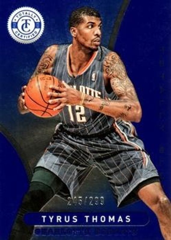 The Tyrus Thomas 2012 Totally Certified #187 Totally Blue /299 card is 1 of 17 Tyrus Thomas' card variations in the 2012 Totally Certified set being tracked by Sports Card Investor, including Base, Totally Red /499, Totally Gold /25, Totally Green /5, and Printing Plate Black /1.