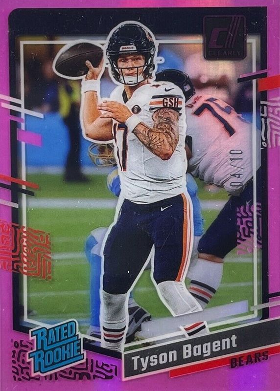 The Tyson Bagent 2023 Clearly Donruss #100 Pink /10 Rookie card in Raw condition has not changed in price in the last 30 days and was last sold for $28.00 .
