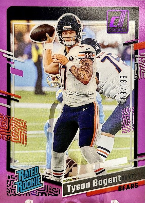 The Tyson Bagent 2023 Clearly Donruss #100 Purple /199 Rookie card in Raw condition has not changed in price in the last 30 days and was last sold for $9.01 .