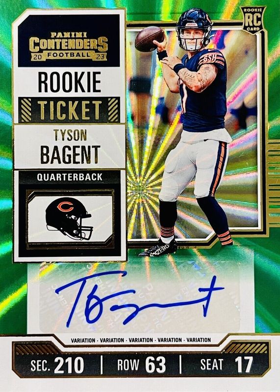 This card is 1 of 31 Tyson Bagent's card variations in the 2023 Contenders set being tracked by Sports Card Investor, including Rookie Ticket Auto, Rookie Ticket Auto - Opening Kickoff Ticket, Rookie Ticket Auto - Red Zone Ticket, Rookie Ticket Auto - Ticket Stub (/17), and Rookie Ticket Auto Variation.