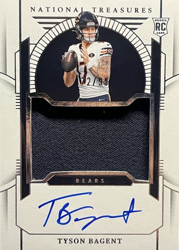 The Tyson Bagent 2023 National Treasures #193 Rookie Patch Auto /99 card in Raw condition has not changed in price in the last 30 days and was last sold for $128.49 .