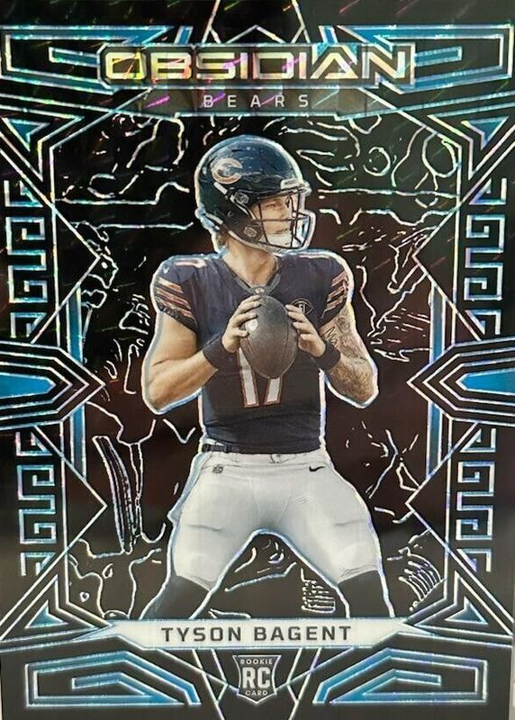 This card is 1 of 24 Tyson Bagent's card variations in the 2023 Obsidian set being tracked by Sports Card Investor, including Base, Asia, Electric Etch Red Flood /90, Electric Etch Purple /75, and Electric Etch Contra /(SSP).