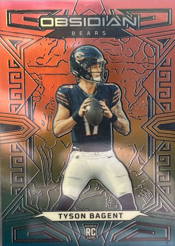 This card is 1 of 24 Tyson Bagent's card variations in the 2023 Obsidian set being tracked by Sports Card Investor, including Base, Asia, Electric Etch Red Flood /90, Electric Etch Purple /75, and Electric Etch Contra /(SSP).