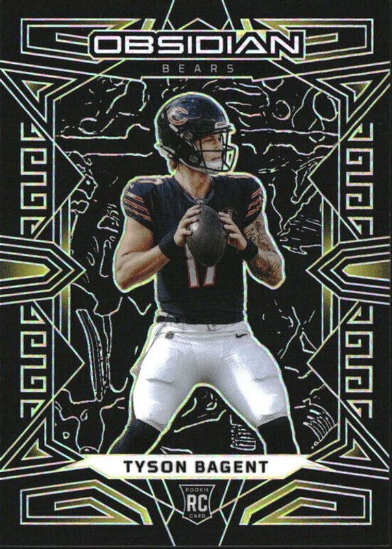 This card is 1 of 24 Tyson Bagent's card variations in the 2023 Obsidian set being tracked by Sports Card Investor, including Base, Asia, Electric Etch Red Flood /90, Electric Etch Purple /75, and Electric Etch Contra /(SSP).