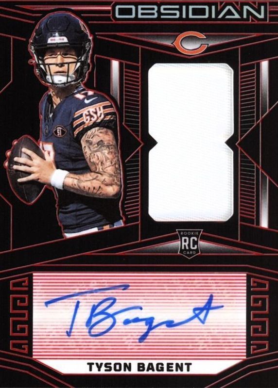 The Tyson Bagent 2023 Obsidian #215 Rookie Jersey Autographs - Electric Etch Red /8 card in Raw condition has not changed in price in the last 30 days and was last sold for $165.00 .