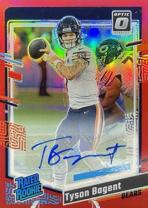 The Tyson Bagent 2023 Optic #216 Rated Rookie Autographs - Red /75 card in Raw condition has not changed in price in the last 30 days and was last sold for $61.00 .