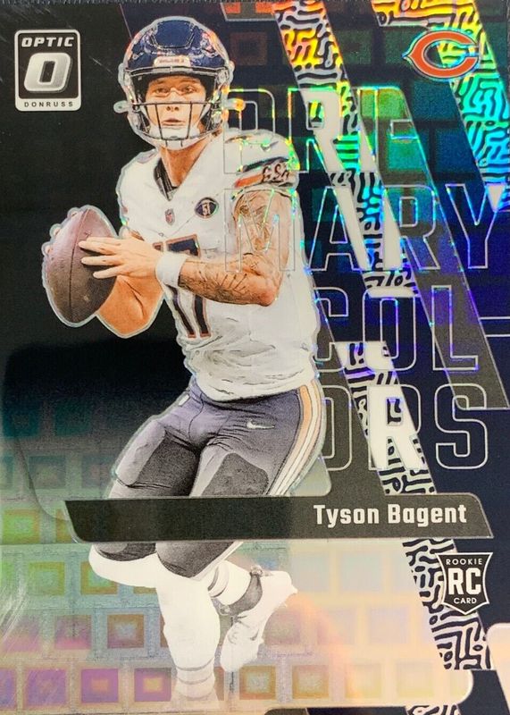 The Tyson Bagent 2023 Optic #14 Rookie Primary Colors - Black Pandora /25 card in Raw condition has not changed in price in the last 30 days and was last sold for $40.00 .