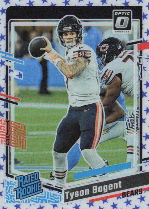 The Tyson Bagent 2023 Optic #216 Stars /(SSP) Rookie card in Raw condition has moved up $11.75 (+362%) in the last 30 days and was last sold for $15.00 .