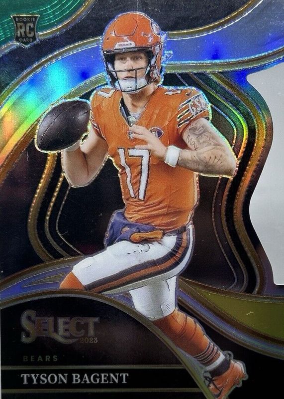 The Tyson Bagent 2023 Select #208 Club Level Green & Yellow Die-Cut Rookie card in Raw condition has not changed in price in the last 30 days and was last sold for $1.00 .