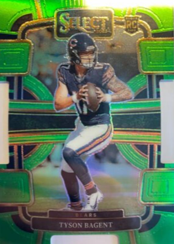 The Tyson Bagent 2023 Select #18 Concourse Neon Green Die-Cut /599 Rookie card in Raw condition has not changed in price in the last 30 days and was last sold for $0.99 .