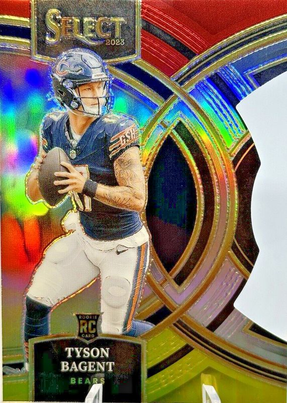 The Tyson Bagent 2023 Select #123 Premier Level Red & Yellow Die-Cut Rookie card in Raw condition has moved down -$0.53 (-26.1%) in the last 30 days and was last sold for $1.50 .