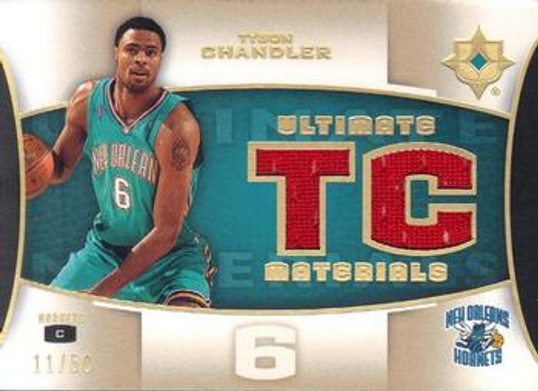 The Tyson Chandler 2007 Upper Deck Ultimate Collection #ULT-TC Ultimate Materials Gold /50 card is 1 of 6 Tyson Chandler's card variations in the 2007 Upper Deck Ultimate Collection set being tracked by Sports Card Investor, including Base /99, Foil /10, Ultimate Materials, Ultimate Signatures /50, and Archetypal Autographs /25.