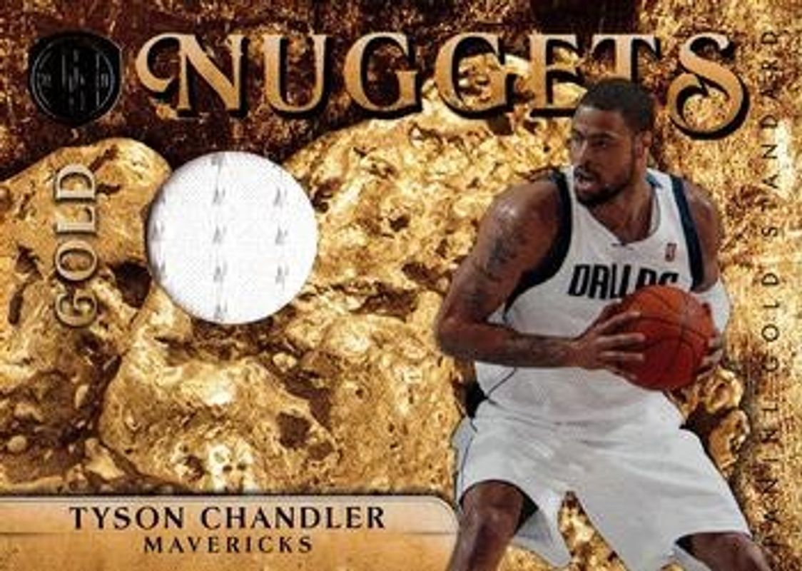 The Tyson Chandler 2010 Gold Standard #35 Gold Nuggets - Materials /199 card is 1 of 26 Tyson Chandler's card variations in the 2010 Gold Standard set being tracked by Sports Card Investor, including Base /299, Platinum Gold /25, Black Gold /1, Gold Crowns /299, and Gold Nuggets /299.