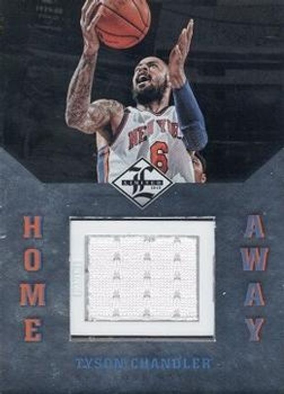 The Tyson Chandler 2012 Limited #10 Home & Away - Materials /99 card is 1 of 6 Tyson Chandler's card variations in the 2012 Limited set being tracked by Sports Card Investor, including Base /349, Silver Spotlight /49, Gold Spotlight /25, Platinum Spotlight /1, and Glass Cleaners Signatures /49.