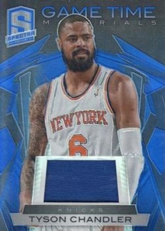 The Tyson Chandler 2013 Spectra #39 Game Time - Materials /15 card is 1 of 16 Tyson Chandler's card variations in the 2013 Spectra set being tracked by Sports Card Investor, including All Stars Jersey Autographs /125, Spectacular Swatch Signatures - Light Blue /60, Jerseys Autographs /49, All Stars Jersey Autographs - Light Blue /40, and Spectacular Swatch Signatures - Orange /35.