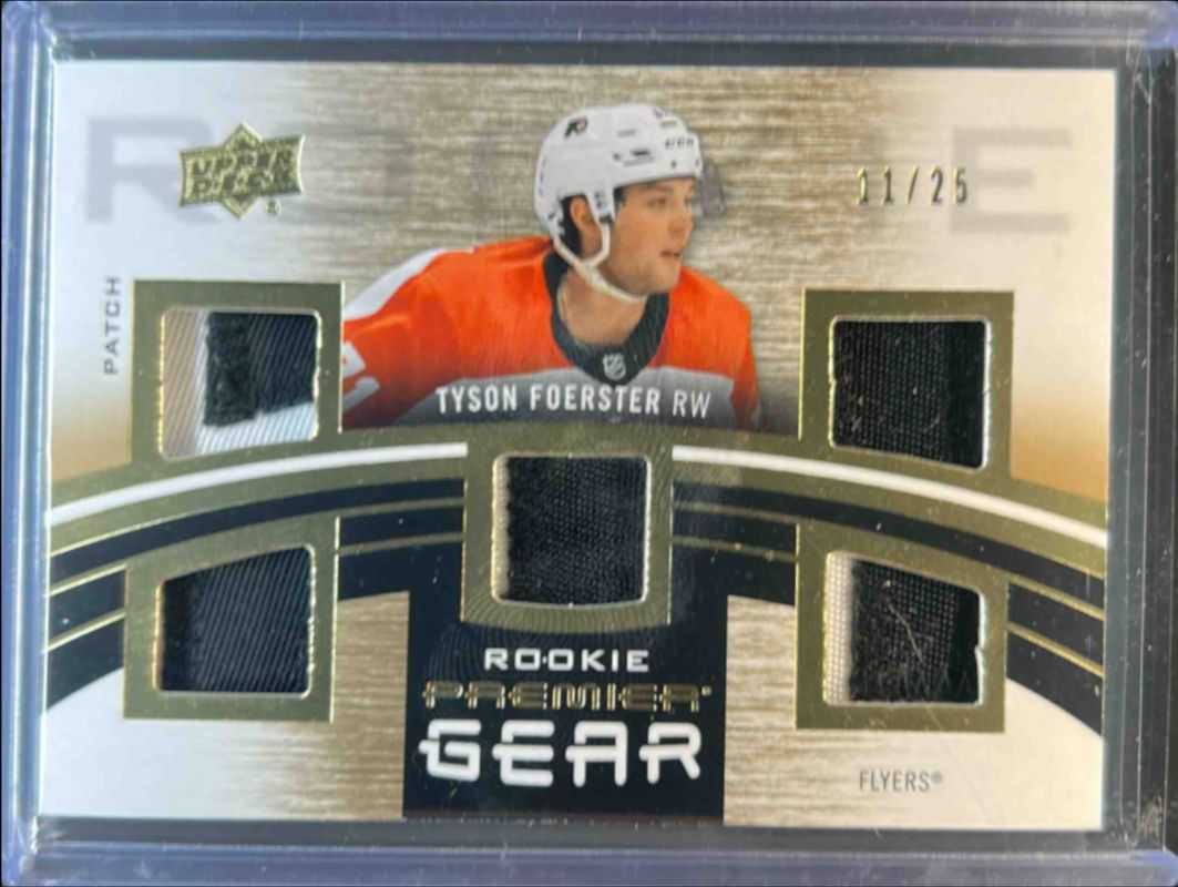 The Tyson Foerster 2023 Upper Deck Premier #PGR-TF Premier Gear Rookies - Patch /25 card is 1 of 40 Tyson Foerster's card variations in the 2023 Upper Deck Premier set being tracked by Sports Card Investor, including Base /399, Bronze /199, Gold /65, Ruby /49, and Rose Gold /25.