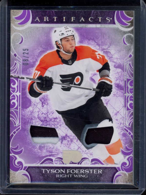 The Tyson Foerster 2024 Upper Deck Artifacts #67 Purple /25 card is 1 of 18 Tyson Foerster's card variations in the 2024 Upper Deck Artifacts set being tracked by Sports Card Investor, including Neon Green, Silver /699, Ruby /399, Emerald /149, and Copper /99.