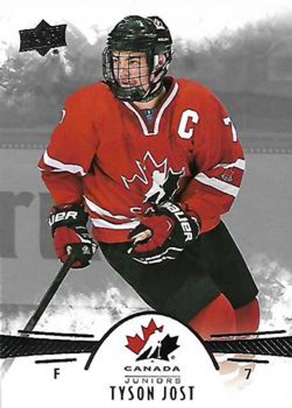 The Tyson Jost 2016 Upper Deck Team Canada Juniors #87 Base card is 1 of 28 Tyson Jost's card variations in the 2016 Upper Deck Team Canada Juniors set being tracked by Sports Card Investor, including #131 Base, #60 Base, #87 Exclusives /175, #60 Exclusives /175, and #60 High Gloss Spectrum /25.