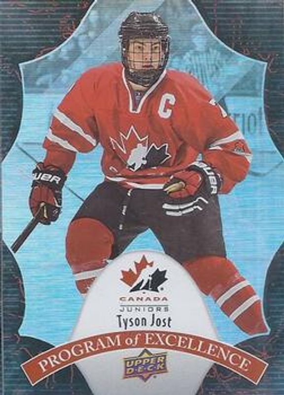 The Tyson Jost 2016 Upper Deck Team Canada Juniors #POE-28 Program of Excellence card is 1 of 28 Tyson Jost's card variations in the 2016 Upper Deck Team Canada Juniors set being tracked by Sports Card Investor, including #87 Base, #131 Base, #60 Base, #87 Exclusives /175, and #60 Exclusives /175.