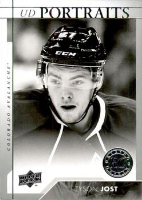 The Tyson Jost 2017 Upper Deck #P-55 UD Portraits Rookie card is 1 of 36 Tyson Jost's card variations in the 2017 Upper Deck set being tracked by Sports Card Investor, including Young Guns Base, Young Guns Canvas, Gold Rainbow Foil, Silver Foil, and Young Guns - Clear Cut.